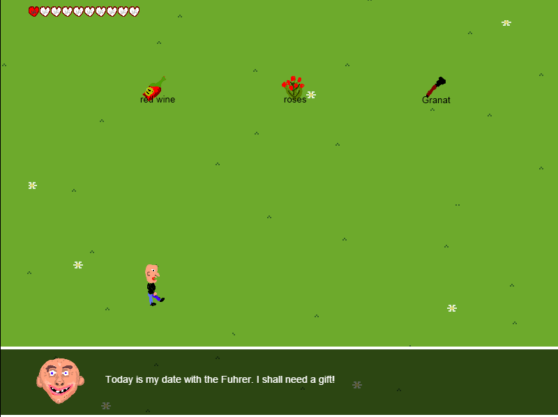 Play as a neo-nazi trying to score with Hitler in action dating-simulation game "Mein Führer".![]() Try your best to impress your darling or end up in Hitlers "friend-zone" (or worse). Made in a three hour train trip using javascript and Canvas Query